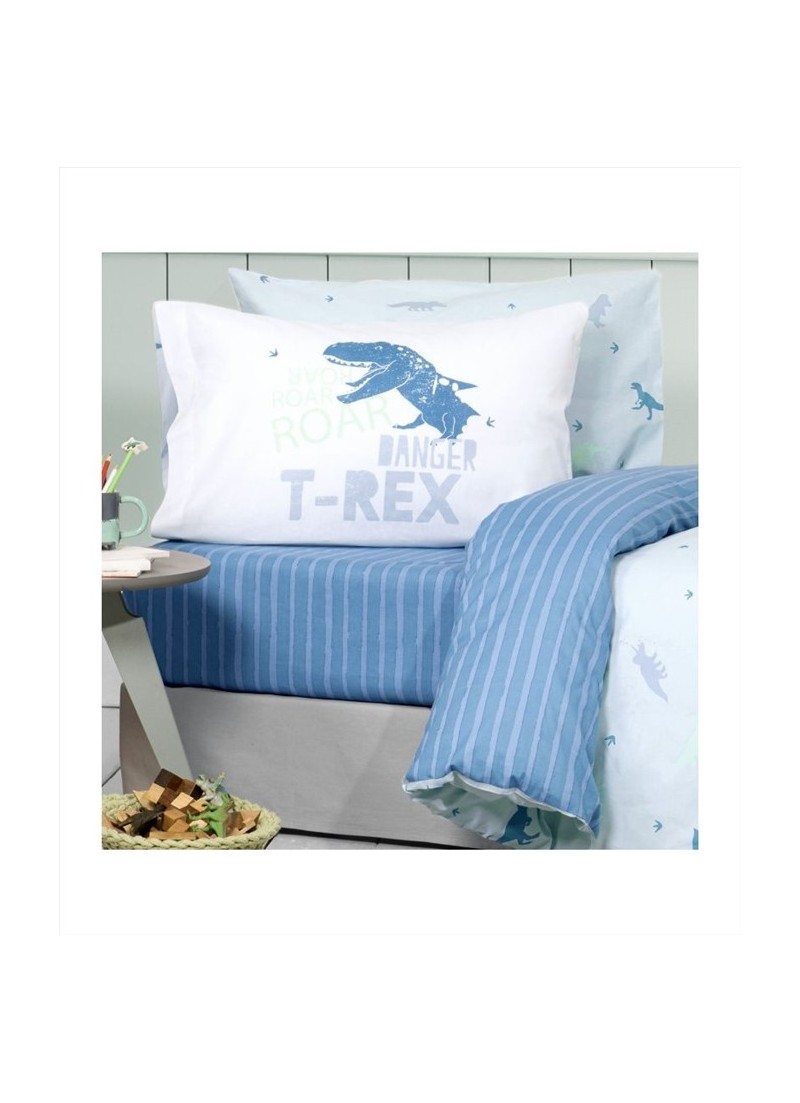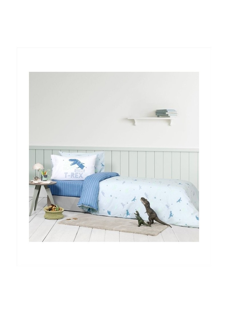 Ο σχεδιασμός του σετ ξεχωρίζει με σιλουέτες δεινοσαύρων T-Rex σε απαλά γαλάζιο φόντο, που δημιουργεί μια ζωηρή και περιπετειώδη ατμόσφαιρα στο παιδικό δωμάτιο.